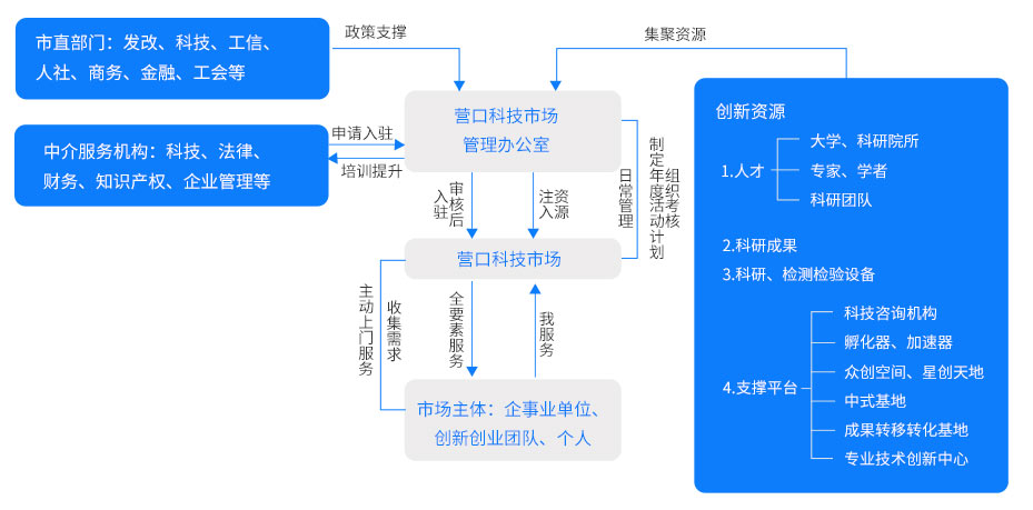 營(yíng)口科技市場(chǎng)是根據(jù)營(yíng)口市委、市政府的總體部署,由營(yíng)口市科技局建設(shè),匯聚科技資源和各類市場(chǎng)要素的綜合服務(wù)平臺(tái),是我市實(shí)施創(chuàng)新發(fā)展戰(zhàn)略,加快國(guó)家創(chuàng)新型城市建設(shè)的一項(xiàng)重要舉措。